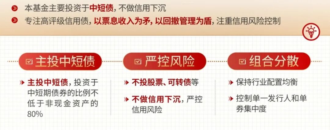 本产品投资于中短期债券的比例不低于非现金资产的80%,不做信用下沉。专注高评级信用债,以票息收入为矛,以回撤管理为盾,注重信用风险控制。