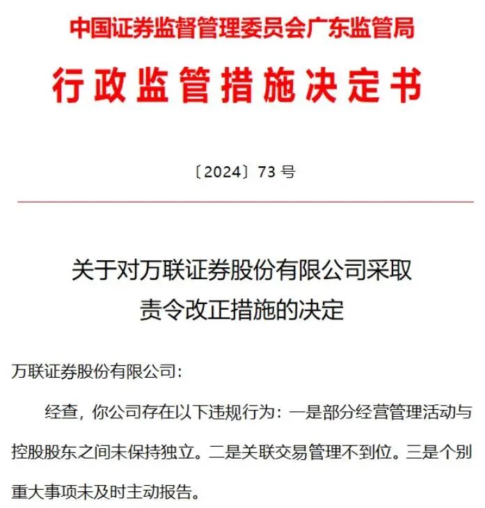 据证监会官网2024年7月4日发布的信息,2024年6月26日,广东证监局决定对万联证券采取责令改正的行政监管措施,主要因万联证券存在部分经营管理活动与控股股东之间未保持独立等违规行为。