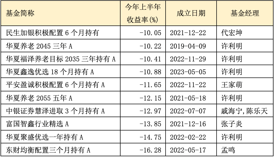 另外,261只今年上半年收益率为负的FOF中,有50只基金的净值跌幅超过5%。其中,十只产品净值下挫逾10%。跌幅居前五名的产品分别是东财均衡配置三个月持有A、华夏聚盛优选一年持有A、富国智鑫行业精选A、中银证券慧泽进取3个月持有A、华夏养老2055五年A,收益率分别为-16.28%、-14.75%、-13.85%、-12.97%、-12.15%。
