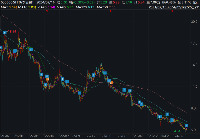 从二级市场来看,自2023年3月起,桃李面包股价便持续下跌,市值较巅峰期缩水已超百亿。