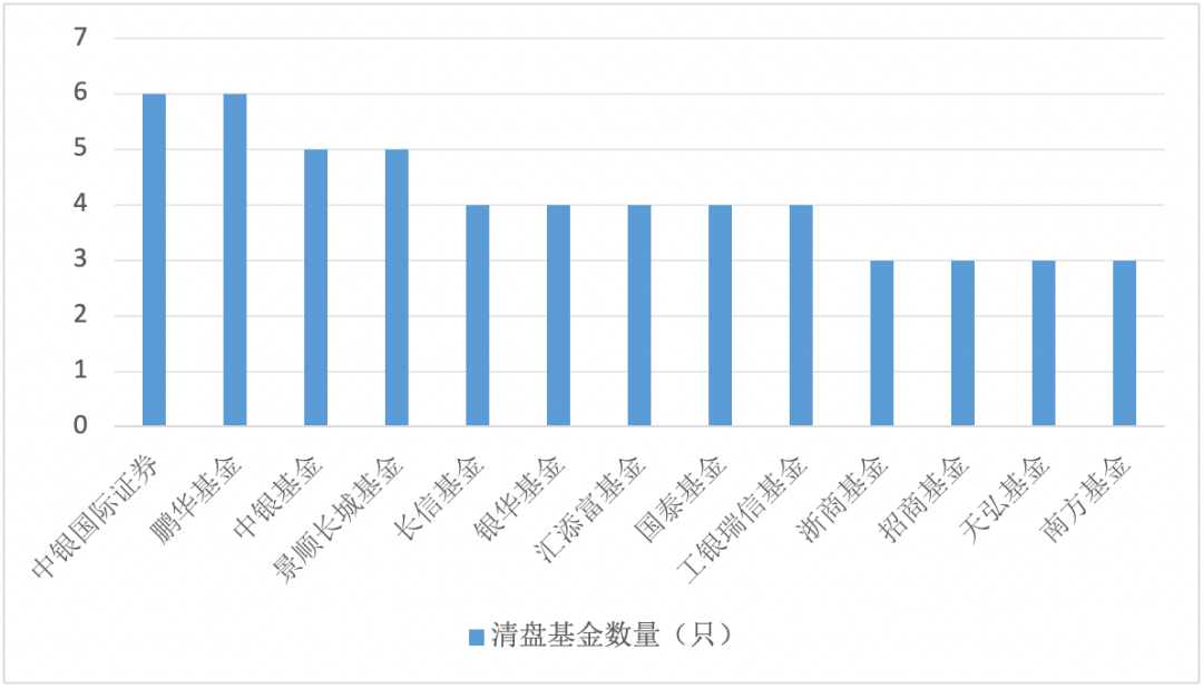 今年以来清盘的125只基金涉及70家基金管理机构,其中清盘产品数量最多的是中银国际证券、鹏华基金,均有六只基金终止运作。另外,中银基金、景顺长城基金旗下皆有五只基金清盘,浙商基金、招商基金、长信基金、银华基金、天弘基金等九家基金管理机构旗下清盘基金数量也均超过三只。