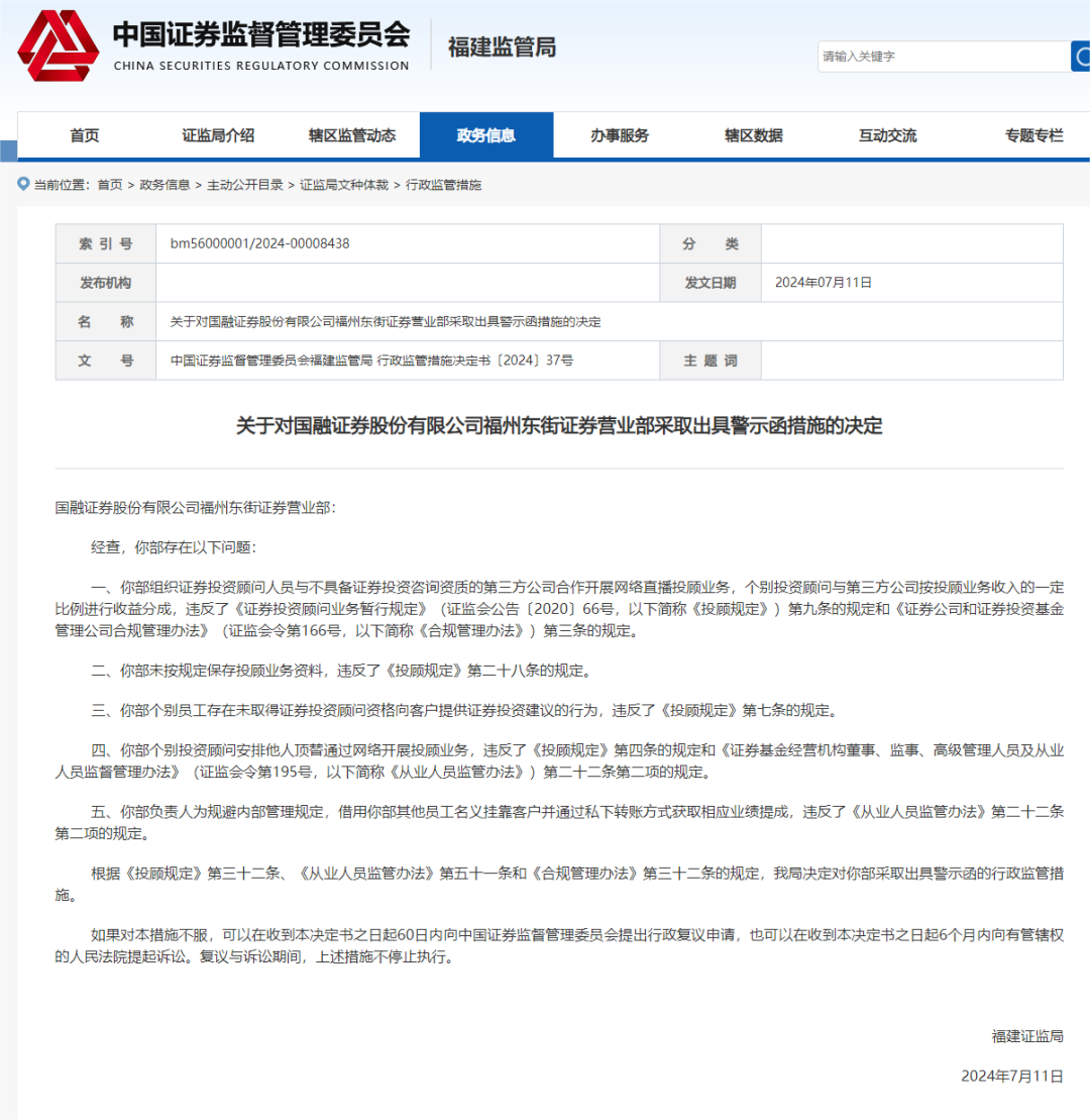 据证监会官网信息,2024年7月11日,福建证监局决定对国融证券福州东街证券营业部采取出具警示函的行政监管措施。原因为该营业部存在组织证券投资顾问人员与不具备证券投资咨询资质的第三方公司合作开展网络直播投顾业务等问题。