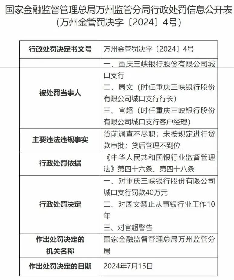 金融监管总局官网信息显示,7月15日,金融监管总局万州监管分局决定对三峡银行城口支行罚款40万元,对时任三峡银行城口支行行长周文禁止从事银行业工作10年,主要原因包括贷前调查不尽职、未按规定进行贷款审批、贷后管理不到位。