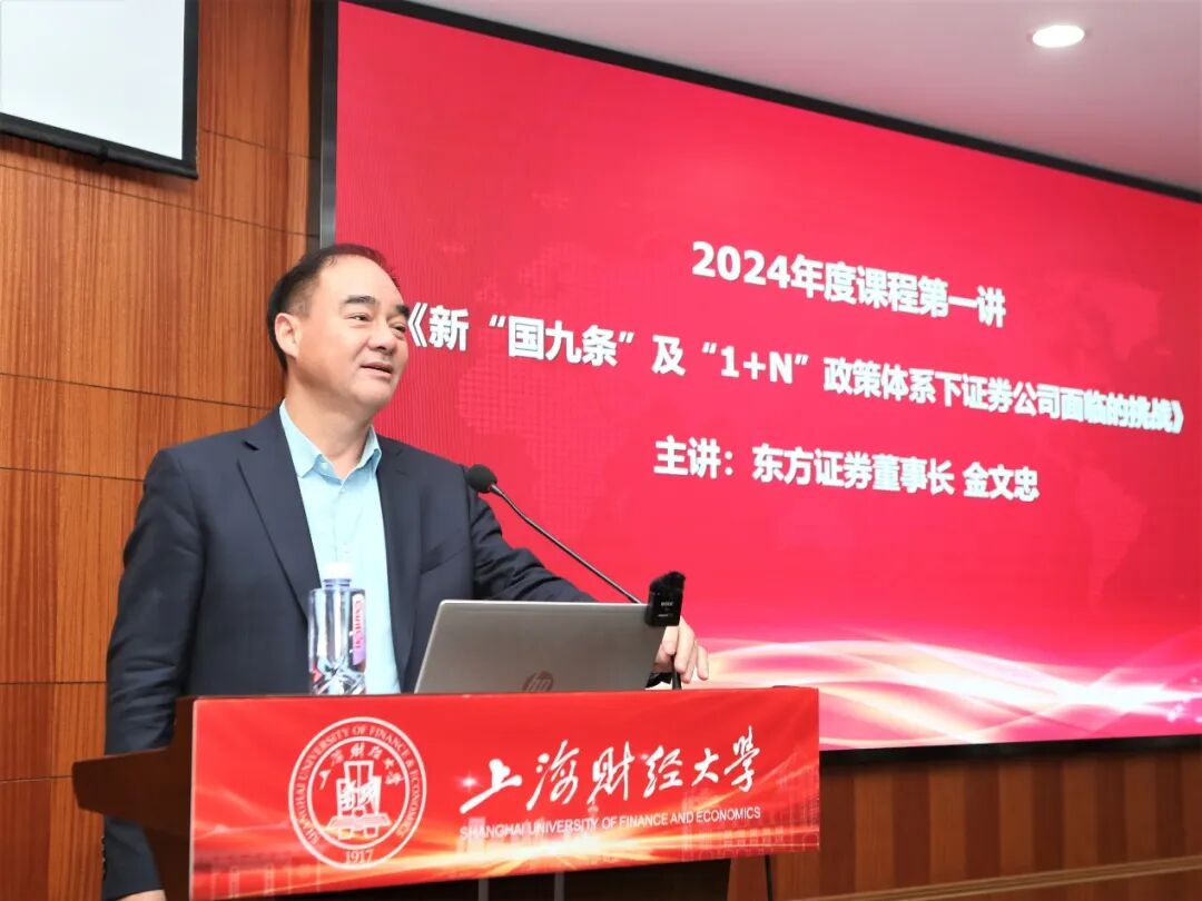 金文忠董事长以《新“国九条”及“1+N”政策体系下证券公司面临的挑战》为主题为本年度课程开课。他深入剖析了“1+N”政策体系出台的背景,阐述了政策核心内容,并结合生动的案例,就其对市场和行业的深远影响以及证券公司面对的挑战进行了详细解读,还为学生专业发展方向和就业做了悉心指导。课程受到了学生的热烈欢迎,课堂上座无虚席,学生听讲认真,发言踊跃。