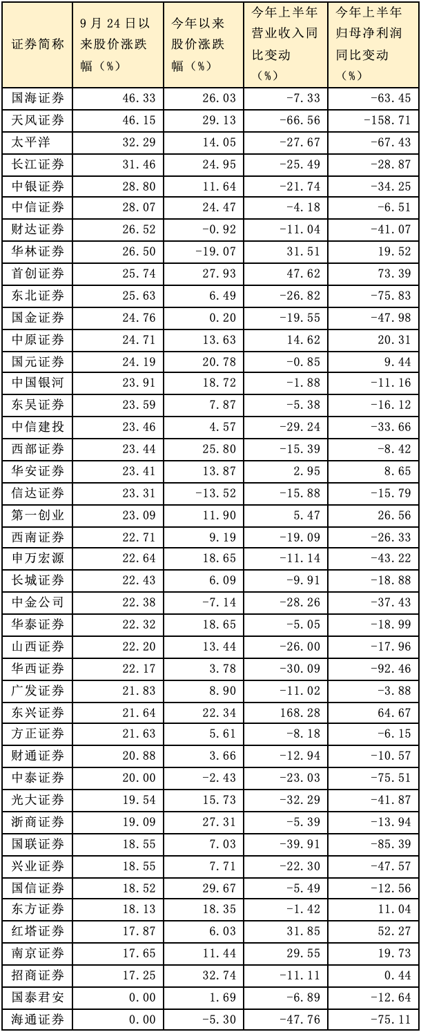 Wind数据显示,9月24日—9月27日,A股41家有交易数据的券商全部上涨,且涨幅均超过17%。