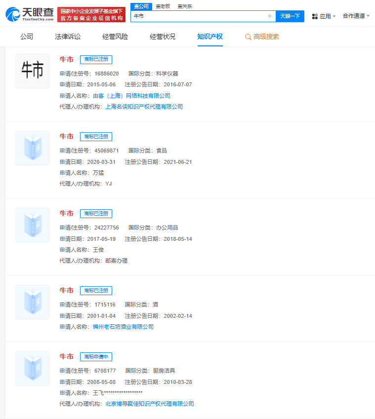 天眼查知识产权信息显示,近期,杭州某科技公司申请注册1枚“大A·牛市”商标,国际分类为餐饮住宿,当时商标状态为等待实质审查。此外,“大牛市”“牛市”“大A牛”已被多方申请注册为商标,国际分类涉及广告销售、教育娱乐、餐饮住宿等,申请人包括多家公司及自然人。其中。“大牛市”“大A牛”商标多为被驳回状态,深圳某文化传播公司申请的“大牛市”商标已成功注册,“牛市”已被多方成功注册商标。