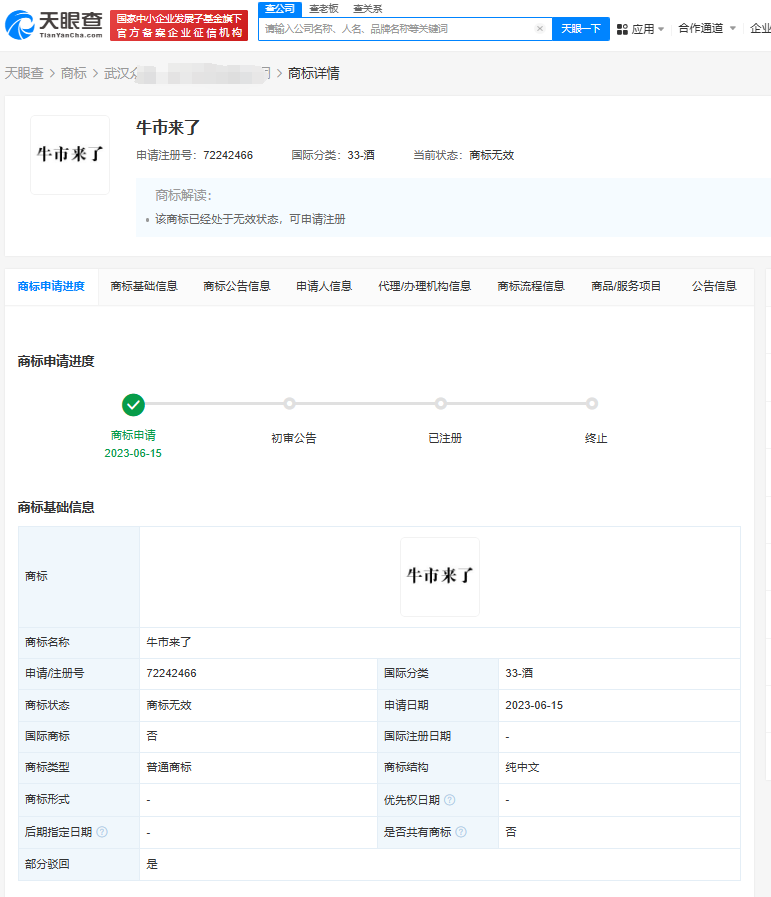 值得一提的是,去年6月,曾有公司申请注册“牛市来了”商标,国际分类为酒,当前商标申请已被驳回,目前处于无效状态。
