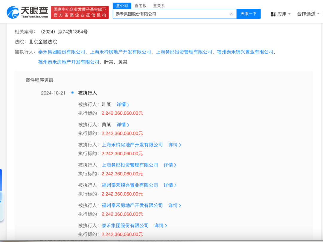 近日,泰禾集团股份有限公司新增5条被执行人和恢复执行信息,天眼查法律诉讼信息显示,执行标的合计40亿余元,涉及金融借款合同纠纷、商品房预售合同纠纷等案件,部分案件被执行人还包括上海禾柃房地产开发有限公司、上海务彤投资管理有限公司等,执行法院包括北京金融法院、福建省福州市中级人民法院等。