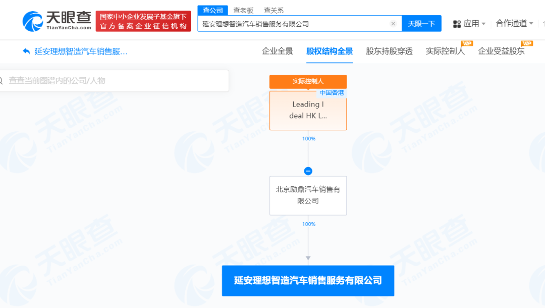 股权全景穿透图显示,该公司由北京励鼎汽车销售有限公司全资持股,后者为理想汽车旗下Leading Ideal HK Limited全资子公司。
