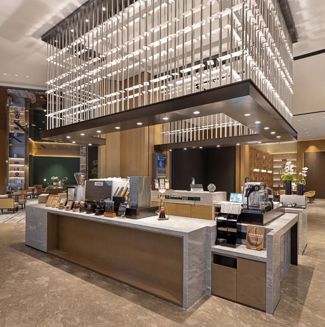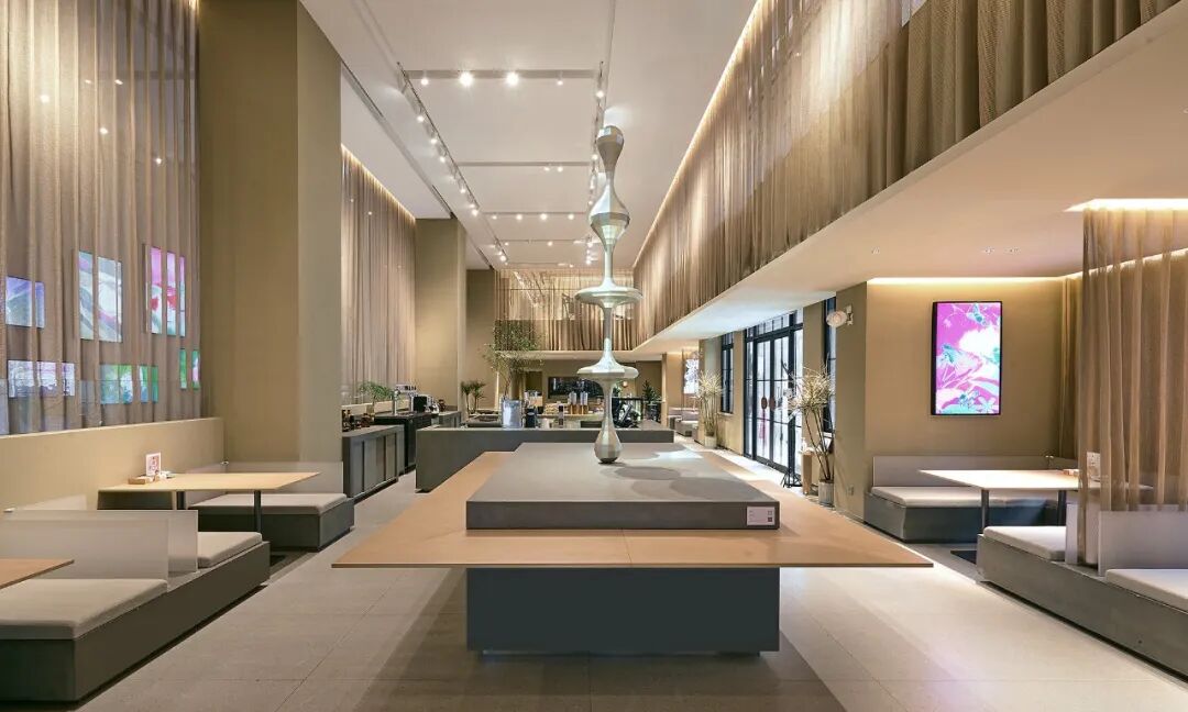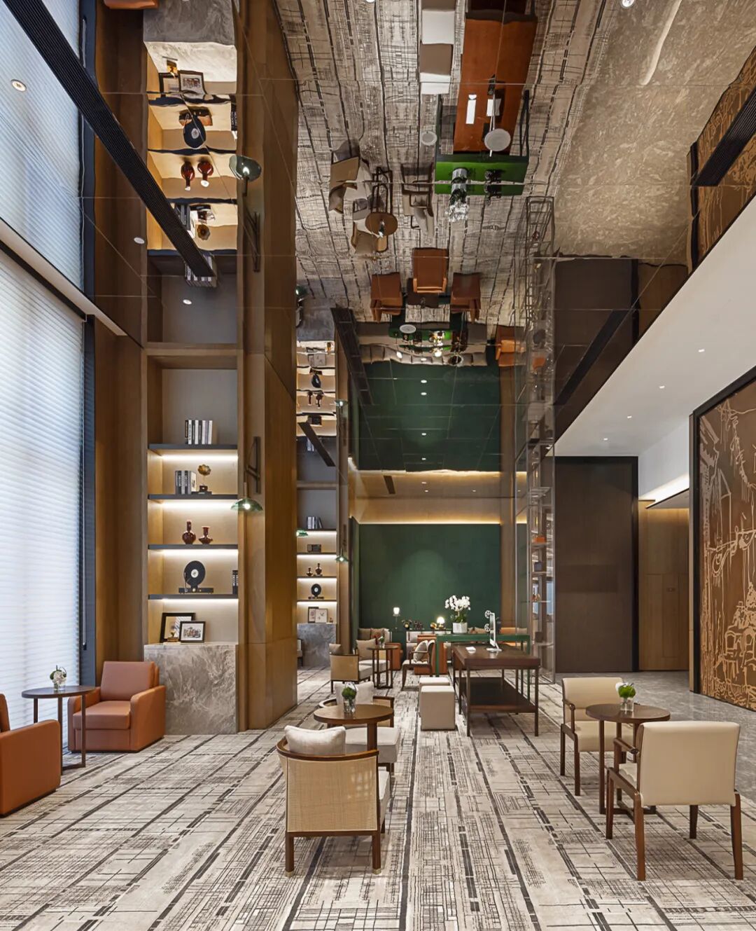 大堂融合了不同的功能区域,每一个区域实现一种生活,它们共同构建了万达颐华所倡导的高端生活方式。
