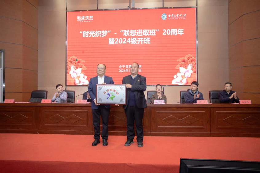 联想控股党委书记、董事长宁旻分别向会宁二中、都匀二中授予“联想进取班”班牌