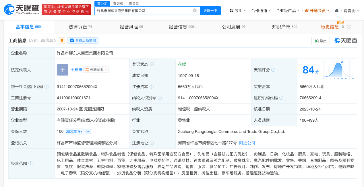 天眼查App显示,胖东来关联企业许昌市胖东来商贸集团有限公司成立于1997年9月,法定代表人、董事长兼总经理为于东来,注册资本5660万人民币,经营范围包括预包装食品兼散装食品、特殊食品销售、餐饮等,于东来持有公司约69.96%股份,为第一大股东及实控人。