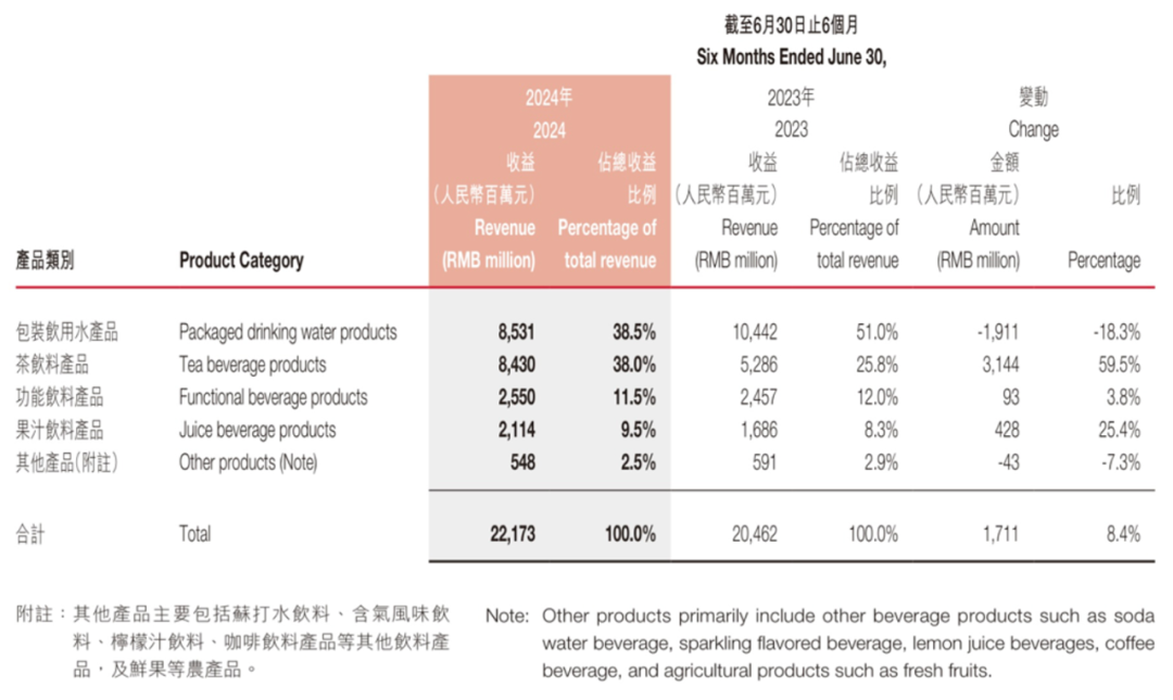 2024年上半年农夫山泉各产品类别收益及占比明细(百万元)