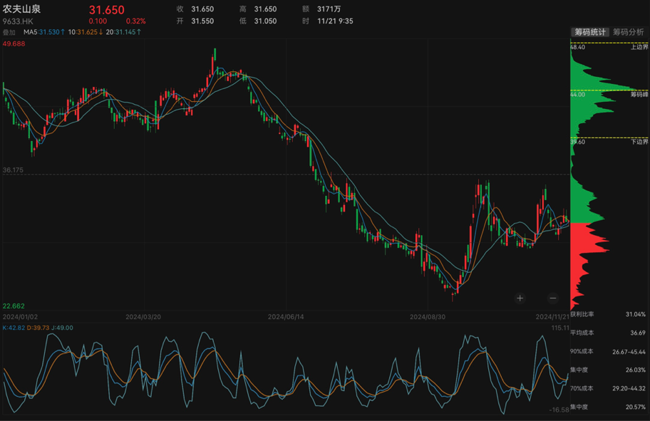 二级市场方面,农夫山泉近期股价持续下行。自今年5月3日盘中创下48.8港元/股(不复权,下同)阶段性高点后,农夫山泉股价便持续震荡下行至今。11月20日,该股下跌1.87%收报31.55港元/股,这一价格较年内高点下挫逾三成。