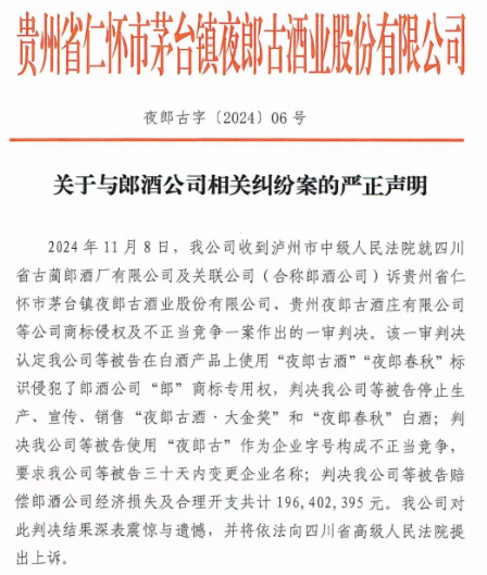 从夜郎古酒业发布的声明来看,其对11月8日收到的泸州中院一审判决书“不服”,表示将提出上诉。