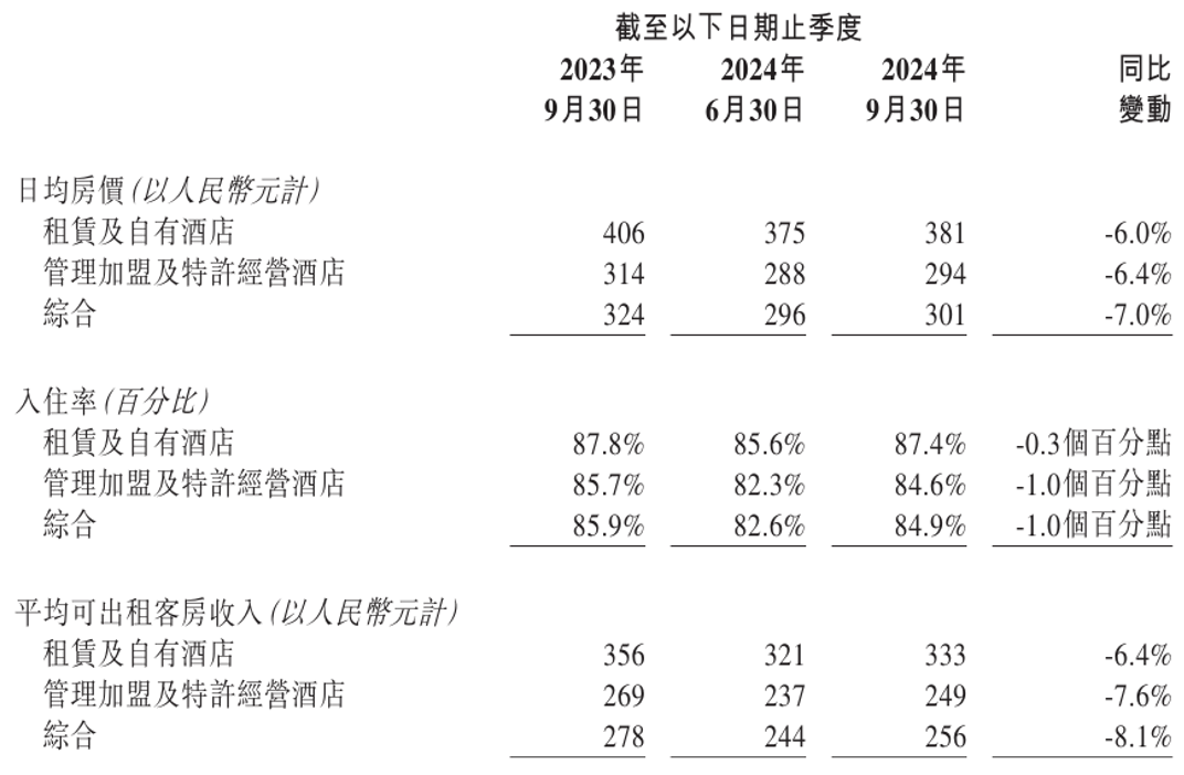 标点财经、投资时间网研究员注意到,从平均可出租客房收入、日均房价及入住率这三个指标来看,2024年第三季度,华住中国分部RevPAR为256元,同比下滑8.1%;同期ADR为301元,同比下滑7.0%;同期OCC为84.9%,同比减少1.0个百分点。