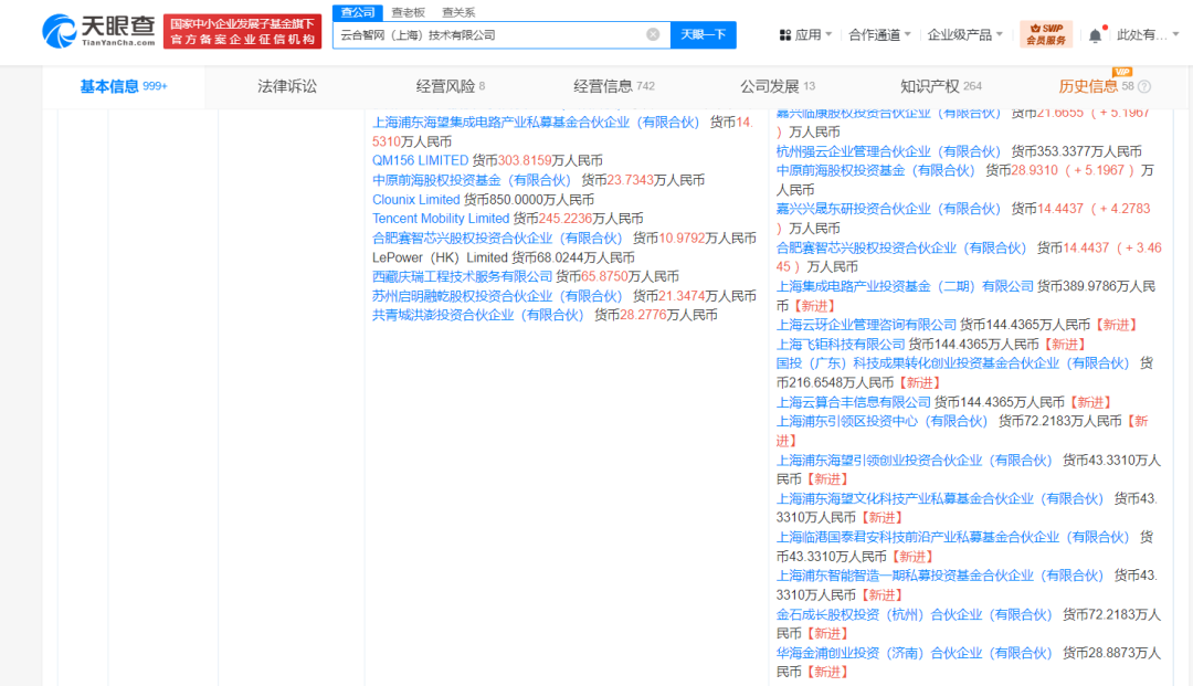 云合智网(上海)技术有限公司成立于2020年11月,法定代表人为陈清华,经营范围含集成电路设计、软件开发、信息系统集成服务、计算机软硬件及辅助设备批发、货物进出口、技术进出口等。股东信息显示,该公司现由Tencent Mobility Limited、杭州强云企业管理合伙企业(有限合伙)、北京中关村芯创集成电路设计产业投资基金(有限合伙)等及上述新增股东共同持股。