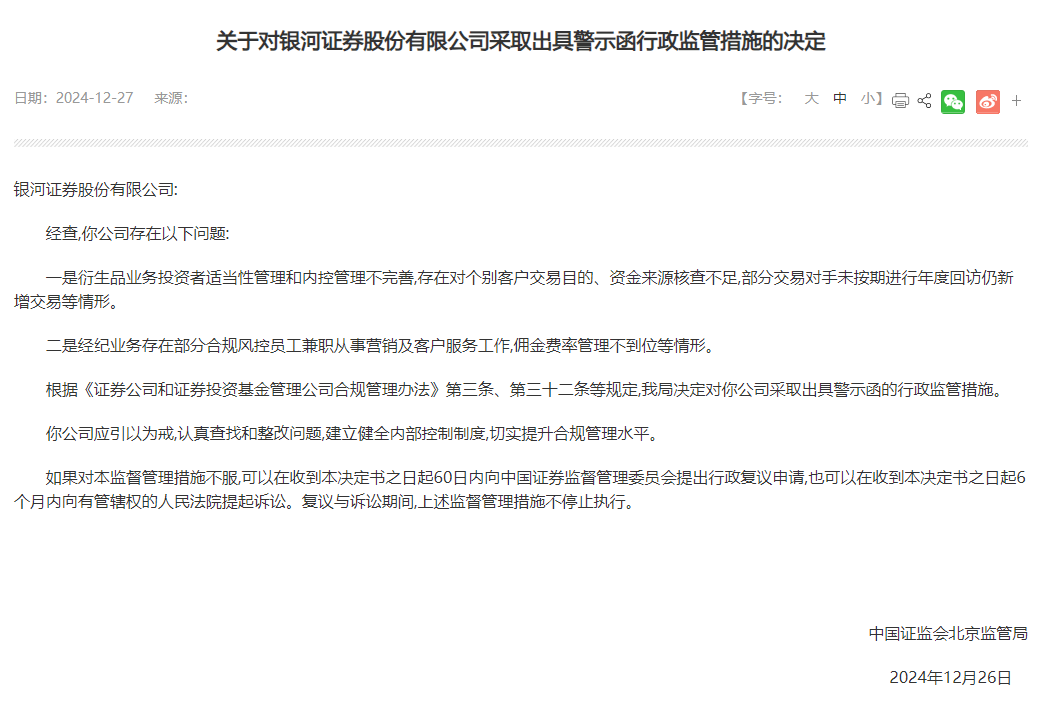 中国证监会官网2024年12月27日发布的信息显示,2024年12月26日,中国证监会北京监管局决定对银河证券采取出具警示函的行政监管措施。