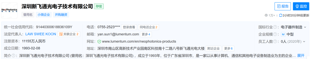 深圳新飞通光电子技术有限公司成立于1993年2月,法定代表人为LAW SWEE KOON,注册资本约1.1亿人民币,经营范围包括光电元器件、光电通讯系统及相关产品的生产经营、技术开发与咨询。