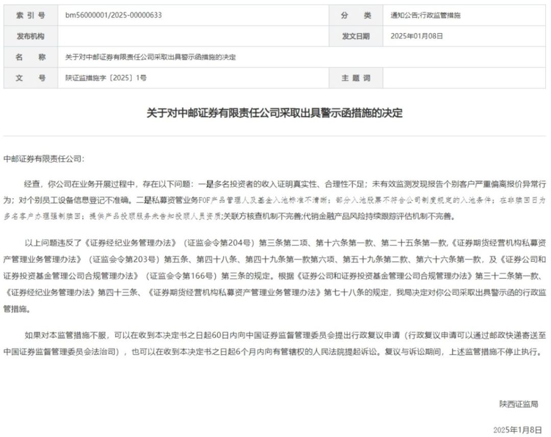 据中国证监会官网信息,2025年1月8日,陕西证监局公布了2025年1号监管措施,决定对中邮证券采取出具警示函的行政监管措施。原因为中邮证券在业务开展过程中,存在多名投资者的收入证明真实性、合理性不足,以及私募资管业务FOF产品管理人及基金入池标准不清晰等问题。