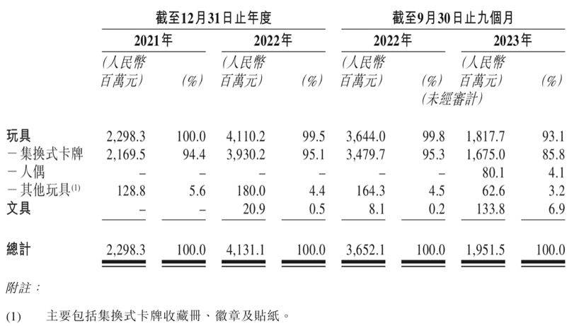 标点财经研究员梳理公司招股书发现,集换式卡牌是卡游的核心产品。招股书显示,2021年、2022年以及2023年前9个月,公司来自集换式卡牌的收入分别为21.70亿元、39.30亿元、16.75亿元,占整体营收的比例分别达94.4%、95.1%、85.8%。