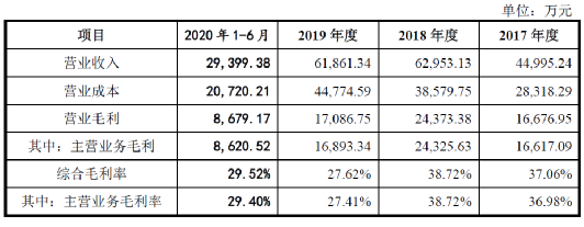 据招股书介绍,2017年至2019年及2020年上半年(下称报告期),该公司营业收入分别为4.5亿元、6.3亿元、6.19元和2.94亿元,2018年较2017年增长近四成,而2019年较2018年下降1.73%;同期,该公司扣除非经常性损益后的归属于母公司股东的净利润波动更为明显,报告期内,分别为0.75亿元、1.04亿元、0.67亿元和0.39亿元,2018年较2017年增长38.67%,而2019年同比下降36.05%。