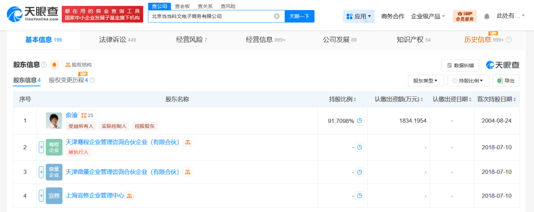 天眼查App显示,近日,北京当当科文电子商务有限公司发生工商变更,李国庆退出该公司股东行列,退出前持股约27.5%。