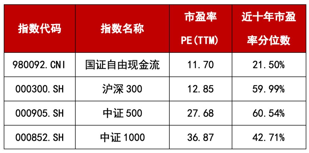 截至2025年6月22日,国证自由现金流指数的市盈率-TTM为11.70倍,低于沪深300(12.85倍)、中证500(27.68 倍)、中证1000(36.87倍)等。此外,该指数当前市盈率处于近十年历史分位点21.50%,具备一定安全边际。