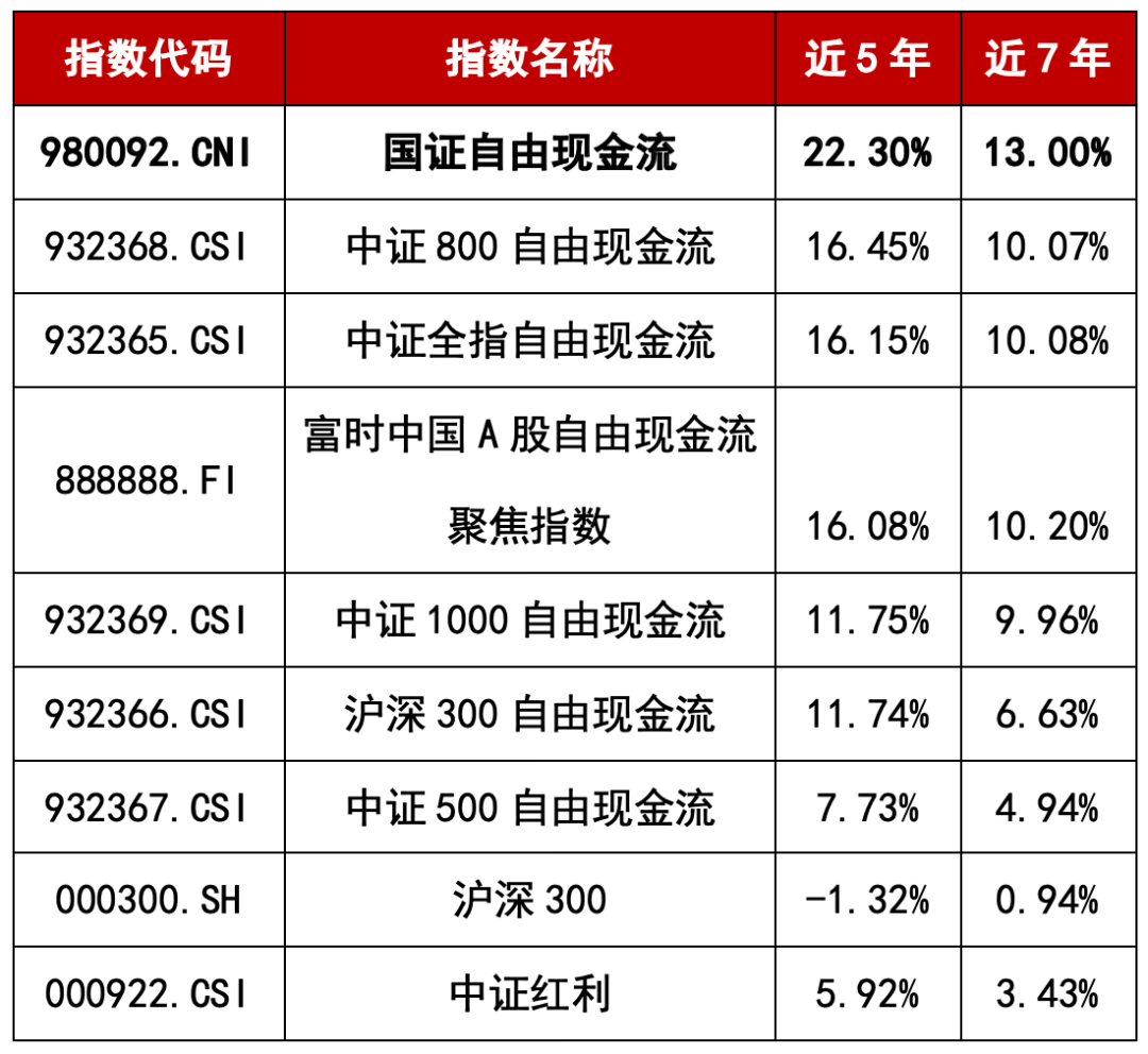 截至2025年6月22日,该指数近5年、近7年年化收益率分别达22.30%和13.00%,大幅跑赢沪深300指数(-1.32% 、0.94%)及中证红利指数(5.92%、3.43%)。与此同时,在全市场七只自由现金流指数中,该指数的近5年、近7年年化收益率均位列第一,在复杂市场环境下的中长期表现显著优于同类指数。(数据来源:Wind,截至2025.6.22,指数历史业绩不预示未来表现)