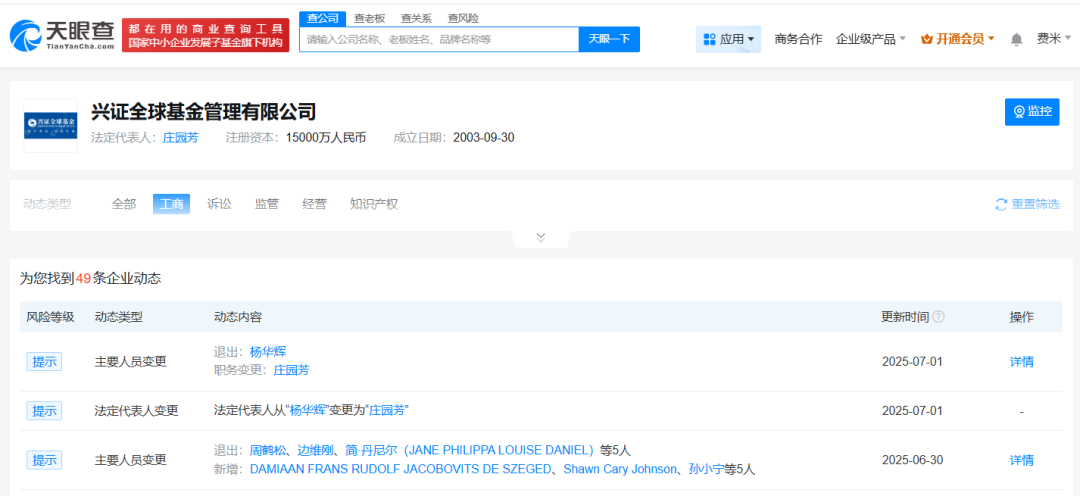 天眼查App显示,近日,兴证全球基金管理有限公司发生工商变更,杨华辉卸任法定代表人、董事长,由庄园芳接任,同时多位主要人员发生变更。