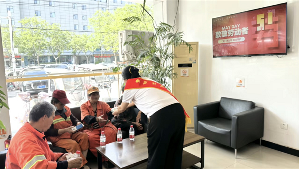 (阳光财险爱心驿站为环卫工人提供饮用水)
