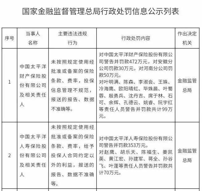 金融监管总局官网7月11日发布的信息显示,金融监管总局决定对太保产险警告并罚款472万元,对安徽分公司罚款30万元,对河南分公司罚款50万元,合计罚款552万元,同时,对16位责任人员警告并罚款共计99万元。主要因未按照规定使用经批准或备案的保险条款、费率,报送的报告、数据不准确等。