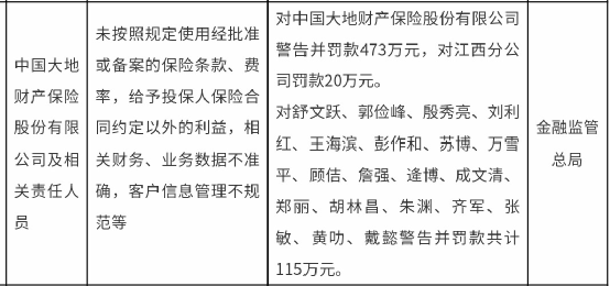 8月1日,金融监管总局官网发布的信息显示,金融监管总局决定对大地财险及相关责任人员作出行政处罚。其中,对大地财险警告并罚款473万元,对江西分公司罚款20万元,对舒文跃等19人警告并罚款共计115万元。合计被罚608万元。