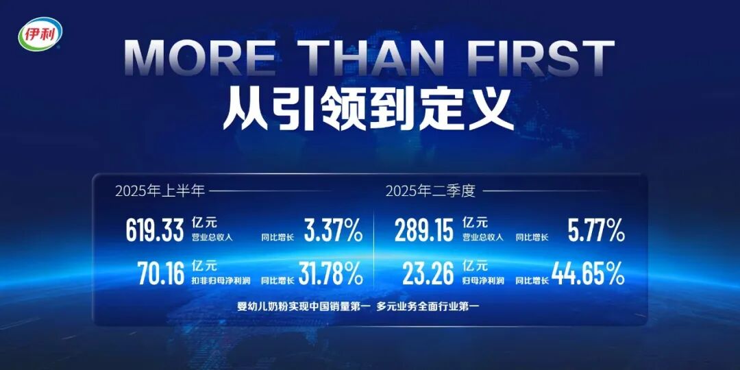 8月28日,内蒙古伊利实业集团股份有限公司(下称伊利股份,600887.SH)发布了量与质双跨越的2025年半年报。财报显示,今年上半年,伊利股份实现营业收入617.77亿元,同比增长3.49%;实现扣非归母净利润70.16亿元,同比增长31.78%;业绩再创历史新高,稳居亚洲乳业第一,绝对龙头领先优势持续扩大。