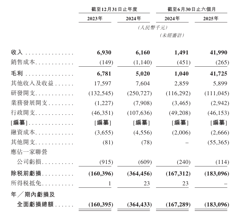 由于这些产品尚未商业化,公司目前仍处于亏损状态。招股书显示,2023年、2024年和2025年上半年(下称报告期),宝济药业分别实现营业收入693万元、616万元和4199万元,分别实现净利润-1.6亿元、-3.64亿元和-1.83亿元。研发开支及行政开支是产生净亏损的主要原因。报告期各期,公司核心产品的研发开支分别为0.8亿元、1.27亿元和0.58亿元,分别占同期总经营开支的44.4%、34.7%和36%。