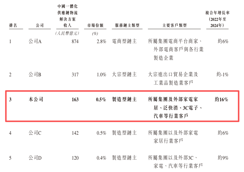 据灼识咨询数据,在综合型一体化供应链物流解决方案市场,按2024年收入计,安得智联收入为163亿元,市场份额为0.5%,排名第三。与排名第四、第五的企业相较,其领先优势相对有限。面对这一竞争格局,安得智联积极推动业务多元化,旨在扩大市场份额并巩固其市场地位。