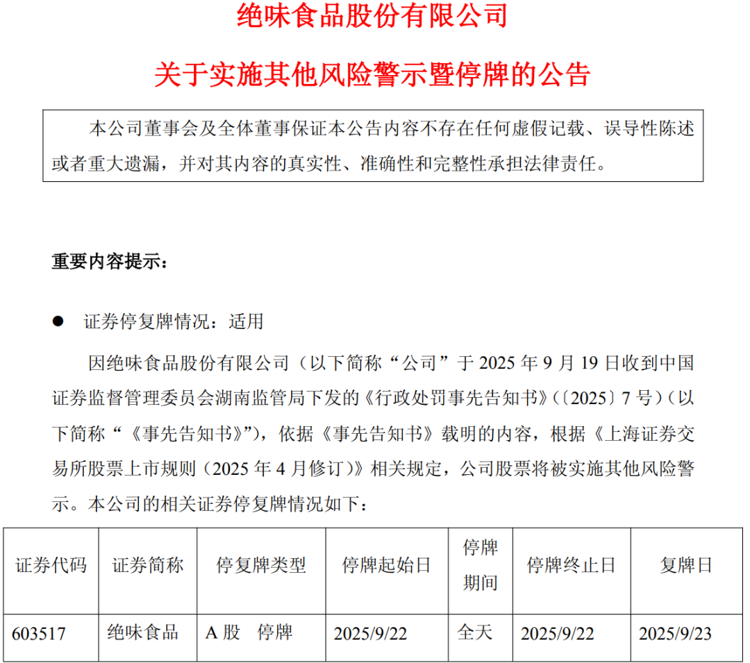 据公司上周五发布的公告,中国证券监督管理委员会湖南监管局(下称湖南局)下发的《行政处罚事先告知书》(下称《事先告知书》)显示,绝味食品涉嫌信息披露违法违规,于公告后的首个交易日(即9月22日)全日停牌,并自9月23日复牌起被实施其他风险警示,股票代码简称将变为“ST绝味”。