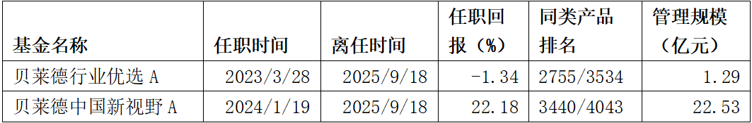 根据Wind数据,截至离任,神玉飞管理的贝莱德行业优选A(2023年3月28日—2025年9月18日)、贝莱德中国新视野A(2024年1月19日—2025年9月18日)任职回报分别为-1.34%、22.18%,分别跑输业绩比较基准收益率18.64个百分点、9个百分点。