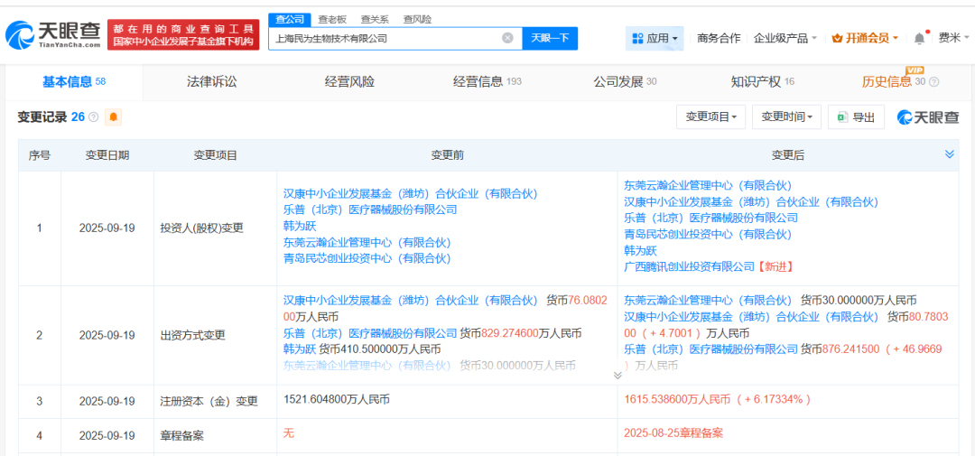 天眼查App显示,近日,上海民为生物技术有限公司发生工商变更,新增广西腾讯创业投资有限公司为股东,同时注册资本由约1522万人民币增至约1616万人民币。