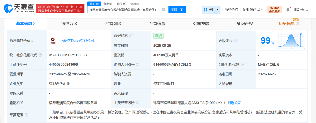 天眼查工商信息显示,近日,横琴粤澳深度合作区产城融合发展基金(有限合伙)成立,执行事务合伙人为中金资本运营有限公司,出资额40.01亿人民币,经营范围为以私募基金从事股权投资、投资管理、资产管理等活动。合伙人信息显示,该基金由横琴粤澳深度合作区财政局、中金资本运营有限公司共同出资。