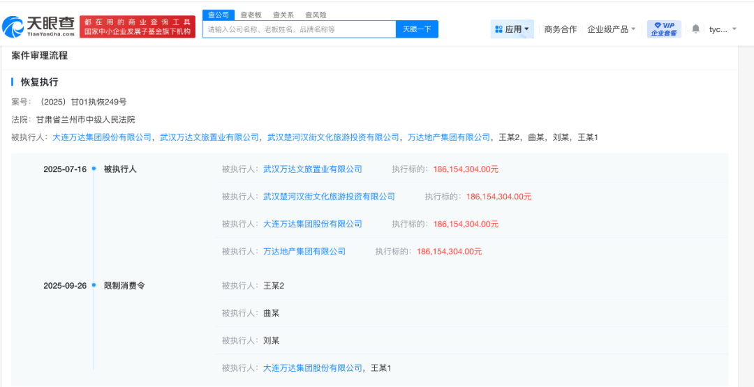 天眼查App显示,近日,大连万达集团股份有限公司及其法定代表人王健林新增一则限制消费令,执行法院为甘肃省兰州市中级人民法院。案件流程信息显示,今年7月,大连万达集团股份有限公司等已因此案被执行1.86亿余元。