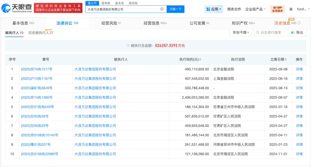 大连万达集团股份有限公司现存10条被执行人信息,被执行总金额超52亿元