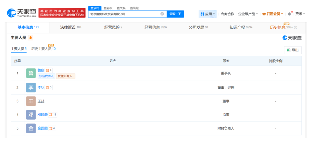 天眼查App显示,近日,北京搜狗科技发展有限公司发生工商变更,叶骏卸任法定代表人、董事长,由鲁剑接任。
