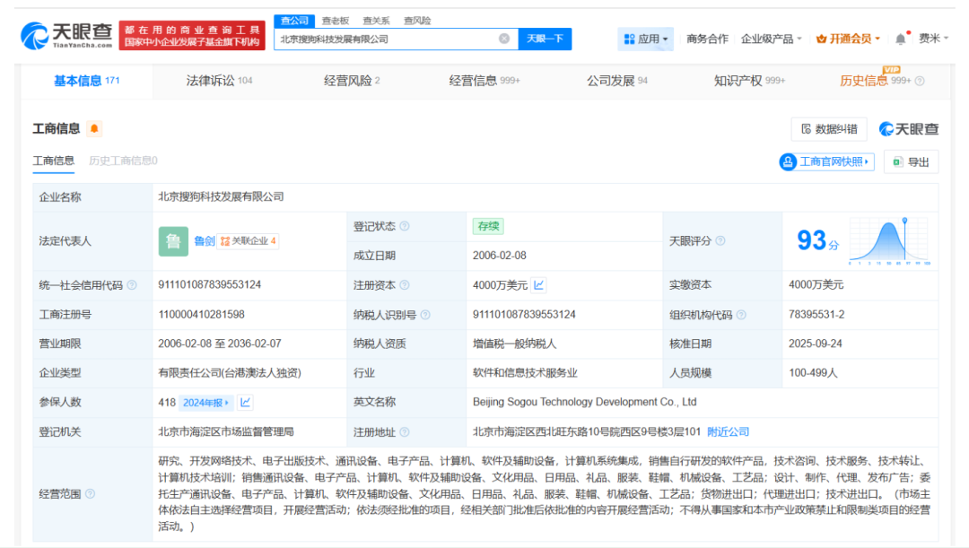 该公司成立于2006年2月,注册资本4000万美元,经营范围包括计算机系统集成、销售自行研发的软件产品、技术进出口等,由Sogou Hong Kong Limited全资持股。