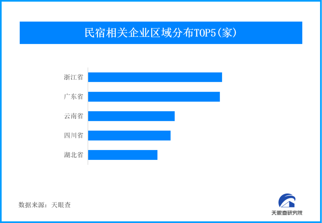 我国民宿相关企业主要分布在浙江省和广东省,分别有超3.9万家、3.8万家相关企业,其次是云南省、四川省、湖北省,均有超2万家相关企业