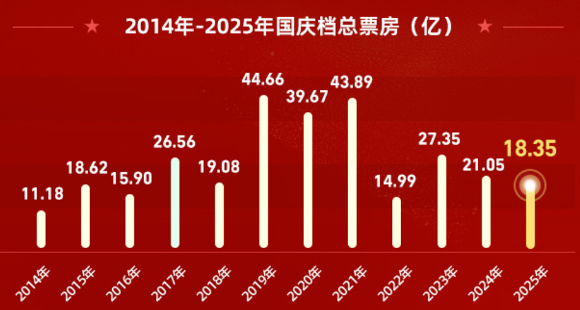 尽管影片数量众多且类型多样,但据国家电影局统计数据显示,今年国庆档电影仅收获总票房18.35亿元,除去疫情期间,已退回至2015年时的水平,该年国庆档电影总票房为18.62亿元。