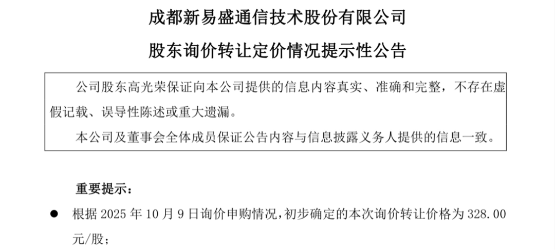 10月9日盘后,新易盛发布《股东询价转让定价情况提示性公告》。公司称,根据当日询价申购情况,高光荣本次转让的价格初步确定为328.00元/股。