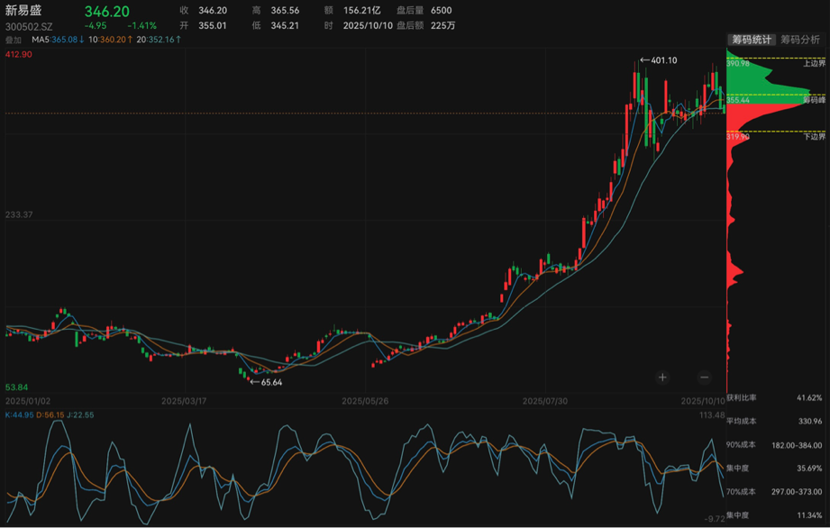 二级市场方面,10月9日节后开盘首日,新易盛逆势下跌4%。截至10月10日收盘,该股报346.2元/股,单日下跌1.41%,总市值为3441亿元。公司股价虽较9月高点回撤超10%,但年内涨幅仍达321%。10月13日,新易盛继续开盘走低。