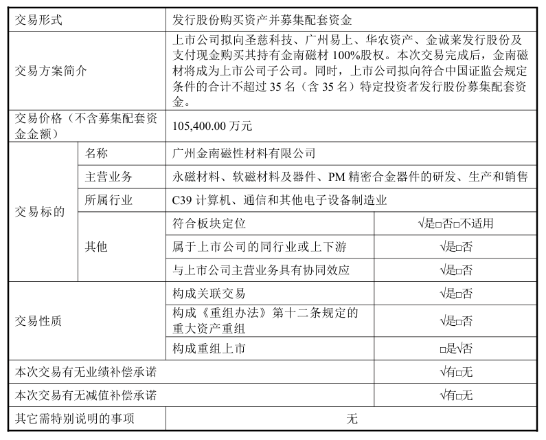 本次交易中,交易对方圣慈科技、广州易上、金诚莱也做出了业绩承诺,即金南磁材承诺期内(2025年度、2026年度和2027年度)净利润分别不低于8156.59万元、8869.17万元和9414.08万元,如业绩承诺期为2026年度、2027年度和2028年度,则净利润分别不低于8869.17万元、9414.08万元和10036.54万元。