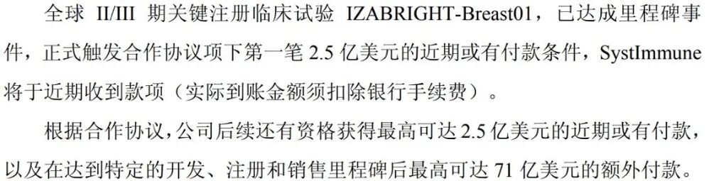 百利天恒近日披露公告称,其全资子公司SystImmune与跨国医药巨头百时美施贵宝(下称BMS)的战略合作取得新进展,因达成里程碑事件,而正式触发合作协议项下第一笔2.5亿美元的近期或有付款条件,SystImmune近期将收到款项(实际到账金额须扣除银行手续费)。